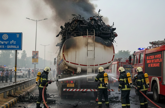 बरनाला(विवेक सिंधवानी, रवि): स्थानीय हंडियाया रोड पर उस समय एक बड़ा हादसा टल गया जब मोटरसाइकिलों से भरे एक टैंकर (ट्रक) में बिजली के तारों की चपेट में आने के कारण भीषण आग लग गई। इस घटना के कारण इलाके में सनसनी फैल गई लेकिन फायर ब्रिगेड की टीम ने तुरंत कार्रवाई करते हुए आग पर सफलतापूर्वक काबू पा लिया और बड़े नुकसान को होने से बचा लिया।