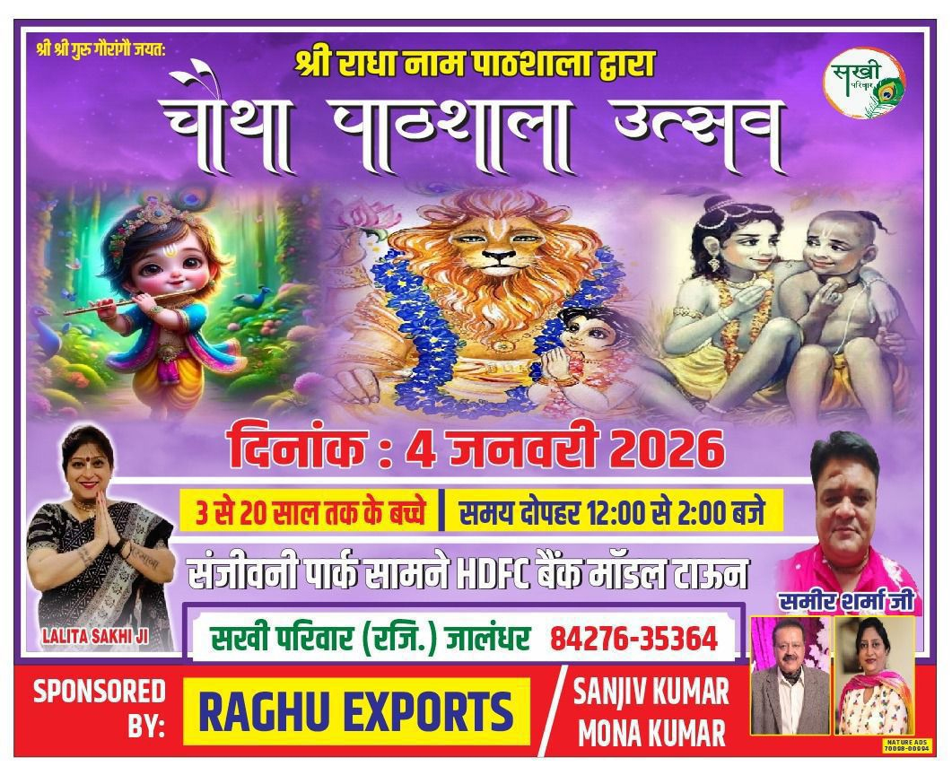 जालंधर : सखी परिवार (रजि.), जालंधर द्वारा श्री राधा नाम पाठशाला के अंतर्गत 4 जनवरी 2026 को जालंधर में चैत्र पाठशाला उत्सव का भव्य आयोजन किया गया। यह आध्यात्मिक और सांस्कृतिक कार्यक्रम माडल टाऊन के संजीवनी पार्क में आयोजित हुआ। कार्यक्रम में 3 से वर्ष ऊपर के बच्चों के लिए रखा गया है, जिसका उद्देश्य नई पीढ़ी को भक्ति, संस्कार और सांस्कृतिक मूल्यों से जोड़ना है। उत्सव में भगवान श्रीकृष्ण, भक्त प्रह्लाद और वैष्णव परंपरा से जुड़े आध्यात्मिक संदेशों को रोचक और प्रेरणादायक स्वरूप में प्रस्तुत किया गया। आयोजन में ललिता सखी जी सहित कई प्रमुख धार्मिक एवं सामाजिक हस्तियां उपस्थिति रहीं।