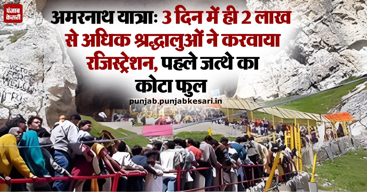 पंजाब डेस्क : अमरनाथ यात्रा के लिए रजिस्ट्रेशन शुरू हो चुकी है और भारी संख्या में श्रद्धालु यात्रा के पंजीकरण करवा रहे हैं। इसी बीच खबर सामने आई है कि यात्रा के पहले जत्थे का कोटा पूरा हो गया है और मात्र 3 दिनों में 2 लाख से अधिक श्रद्धालुओं ने पंजीकरण करवा लिया है।
