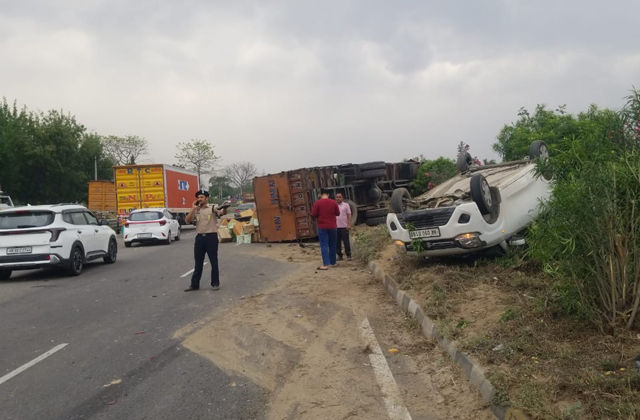 Jalandhar : हाईवे पर पलटियां खाते गिरा ट्रक, कार के उड़े परखच्चे