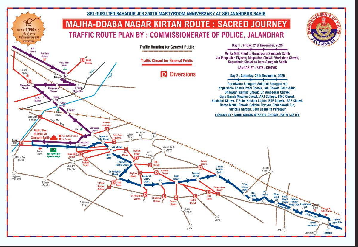 संगत की भारी आमद के मद्देनज़र, नगर कीर्तन के इस निर्धारित रूट को ध्यान में रखते हुए, कमिश्नरेट पुलिस जालंधर ने नीचे दिए गए अनुसार विभिन्न प्वाइंट/चौराहों से यातायात को डायवर्ट किया है, ताकि ट्रैफिक व्यवस्था सुचारू और बिना बाधा के चलती रहे।