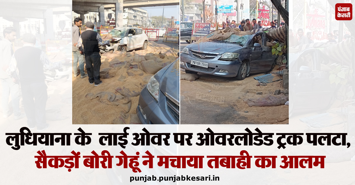 लुधियाना : महानगर के सबसे व्यस्त माने जाने वाले भारत नगर चौक फ्लाई-ओवर पर आज सुबह उस समय चीख-पुकार मच गई, जब एक ओवरलोडेड ट्रक असंतुलित होकर पलट गया। हादसे की भयावहता का अंदाजा इसी बात से लगाया जा सकता है कि ट्रक में लदी गेहूं की सैकड़ों बोरियां फ्लाई-ओवर से नीचे खड़ी गाड़ियों और दुकानों पर जा गिरीं। इस हादसे में कई कारें, मोटरसाइकिल और दुकानें बुरी तरह क्षतिग्रस्त हो गई हैं, जिससे लाखों का नुकसान होने की आशंका है।