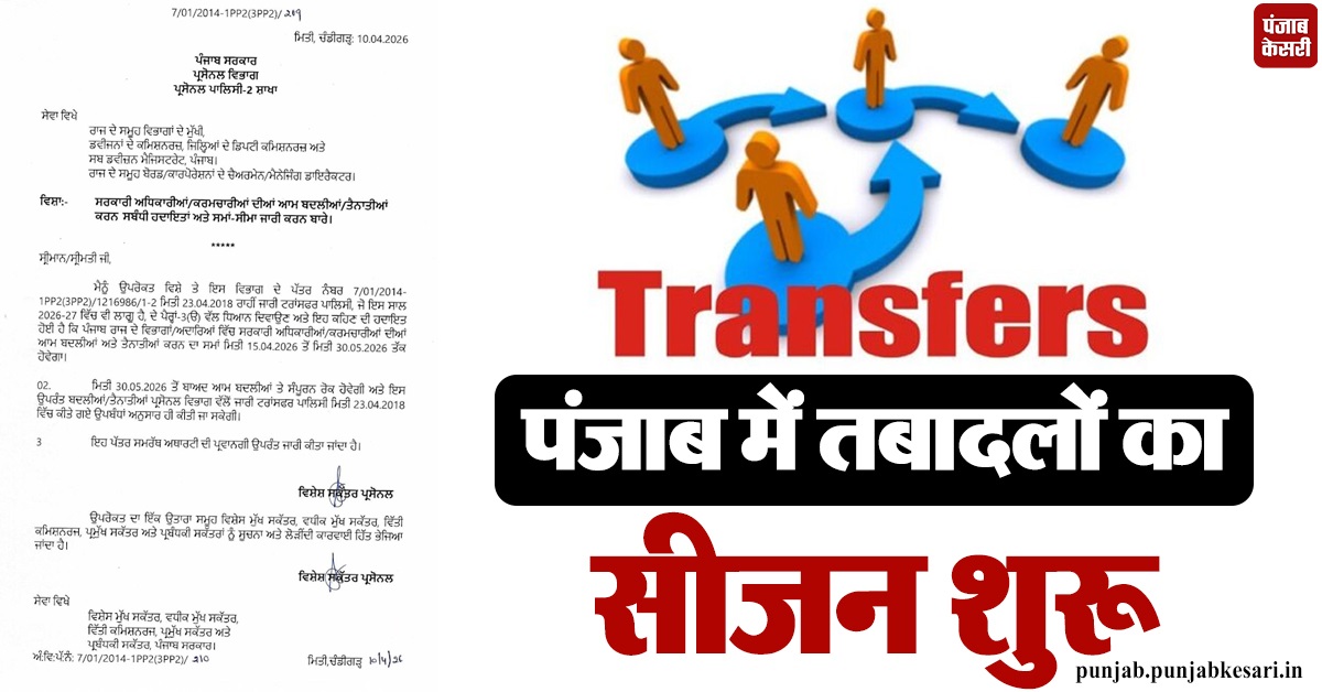 चंडीगढ़/लुधियाना(राज): पंजाब के सरकारी गलियारों में हलचल तेज होने वाली है क्योंकि मान सरकार ने राज्य के अधिकारियों और कर्मचारियों के तबादलों को लेकर हरी झंडी दे दी है। पंजाब सरकार के कार्मिक विभाग (Personnel Department) ने साल 2026-27 के लिए नई ट्रांसफर पॉलिसी के तहत आदेश जारी कर दिए हैं। इन आदेशों के मुताबिक, राज्य के विभिन्न विभागों में तैनात अधिकारियों और कर्मचारियों के सामान्य तबादले अब 15 अप्रैल 2026 से शुरू होकर 30 मई 2026 तक किए जा सकेंगे।