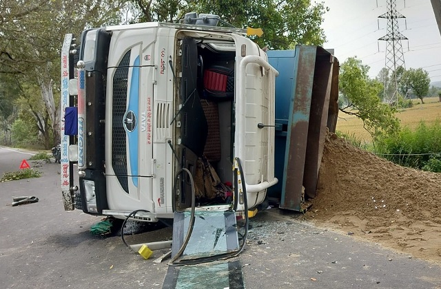 मुख्य मार्ग पर रेत से लदा टिप्पर पलटा, चालक गंभीर घायल