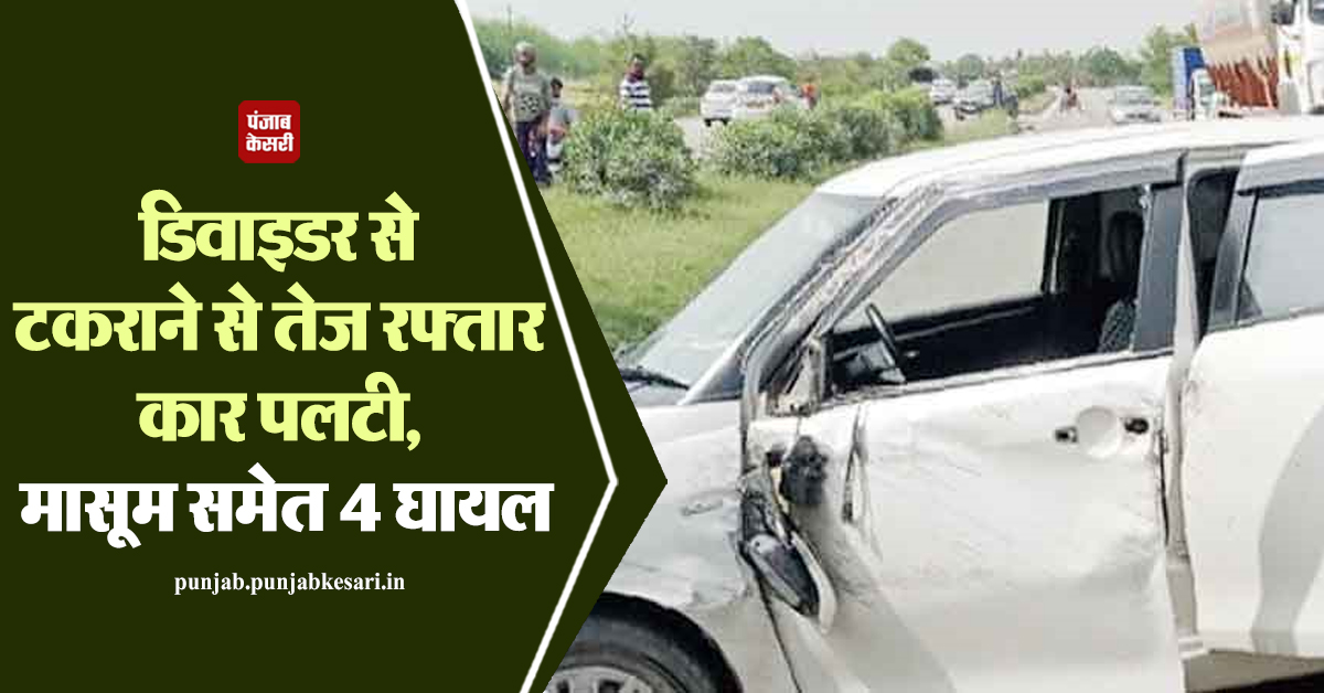 डिवाइडर से टकराने से तेज रफ्तार कार पलटी, मासूम समेत 4 घायल