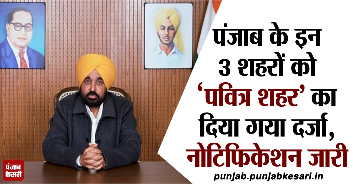 जालंधर/चंडीगढ़ : पंजाब सरकार ने राज्य के तीन बड़े धार्मिक शहरों को पवित्र शहर का दर्जा देने के अपने फैसले को लागू कर दिया है। इस बारे में सरकार की तरफ से अधिकारित नोटिफिकेशन जारी कर दी गई है। यह जानकारी मुख्यमंत्री भगवंत मान ने सोशल मीडिया पर लाइव दी। मुख्यमंत्री भगवंत मान ने कहा कि इस फैसले का ऐलान सबसे पहले श्री गुरु तेग बहादुर जी के 350वें शहीदी दिवस के मौके पर श्री आनंदपुर साहिब में किया गया था। उन्होंने यह अहम फैसला लेने की ताकत देने के लिए परमात्मा का शुक्रिया अदा किया।